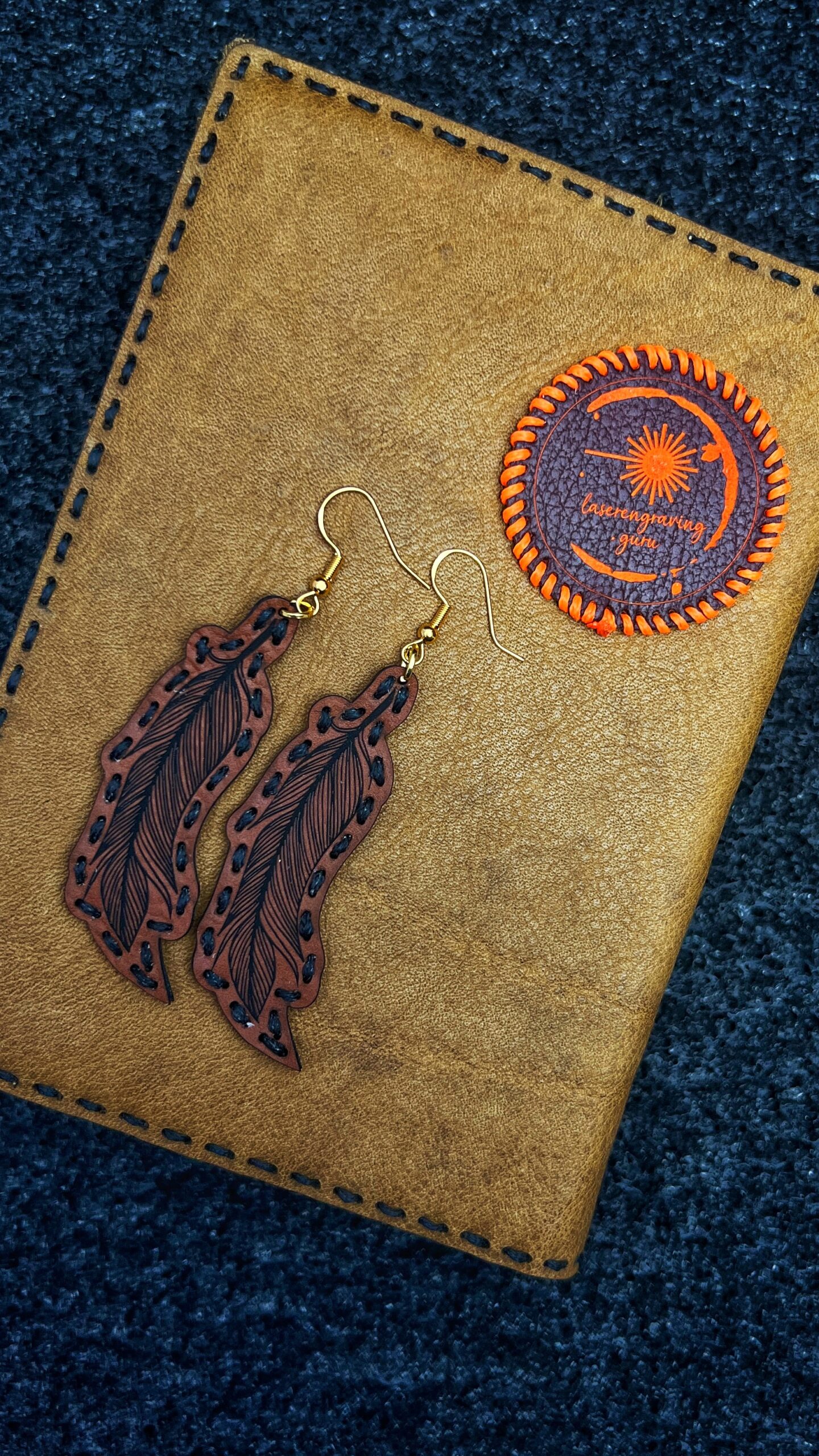 Using Trotec’s range of two-tone laserable synthetic leathers, this cover was engraved, cut and then hand-stitched. The range of colours available from Trotec is quite nice and affordable in comparison to real leather.